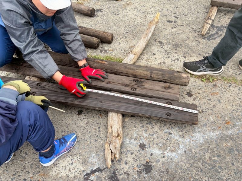 切る班はまず、木材の長さを測るところから。