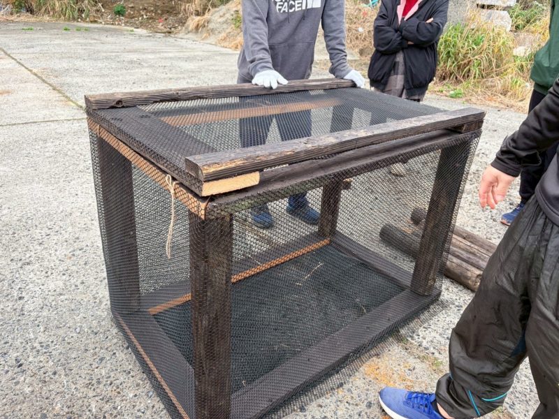 メッシュを取り付け、ふたを付けて…拾い箱が完成!
