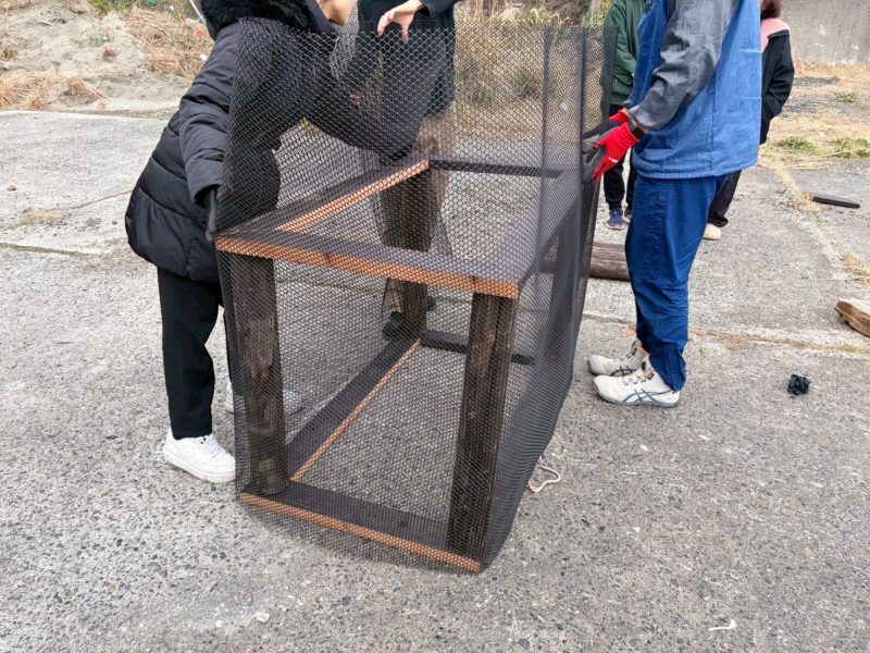 一方、組み立て班は材料がそろうまで、拾い箱の周りに巻くメッシュをカット。
